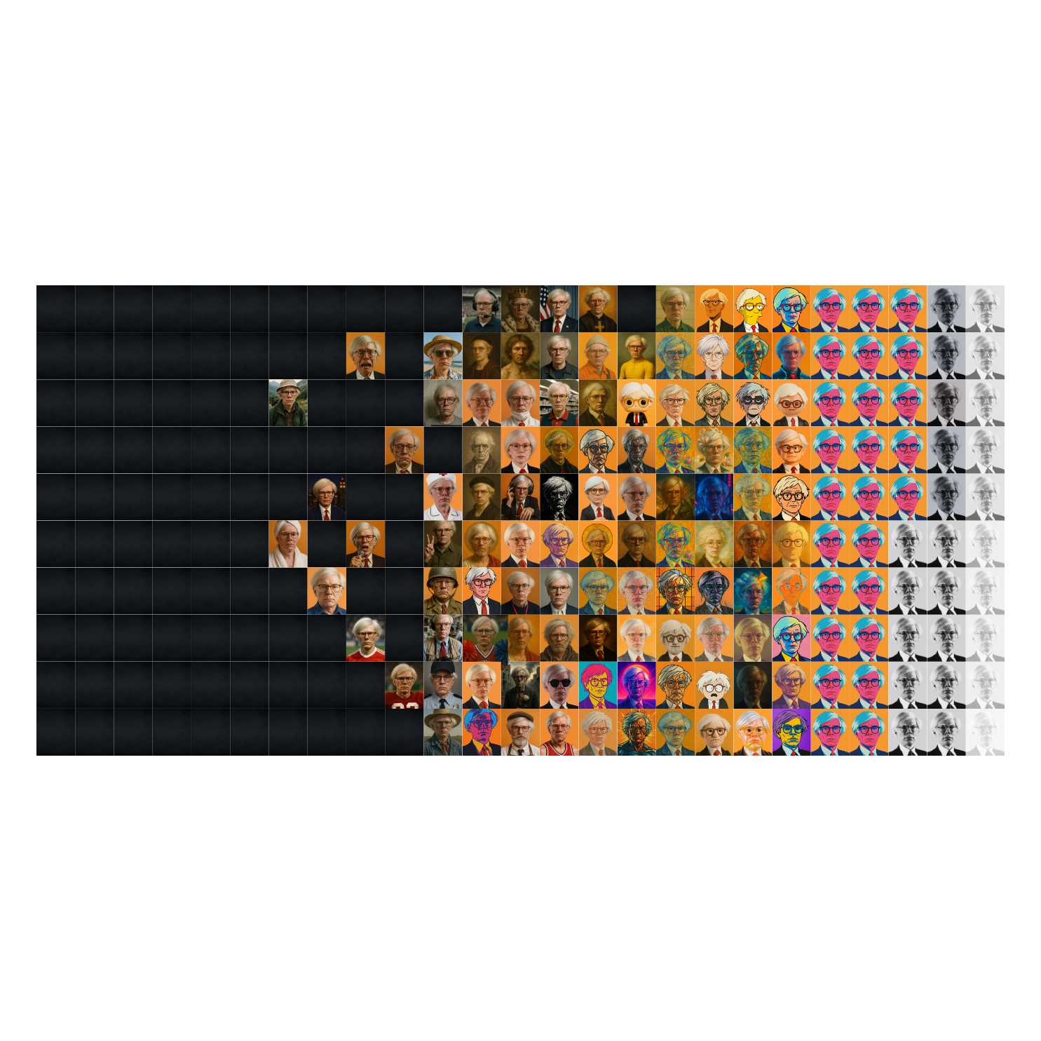 The final composition of the Polyptych is shaped with the collector. You are invited to select which Andys form the full piece and how they are arranged. Together we decide how the wall will appear before it is printed, signed, and certified.