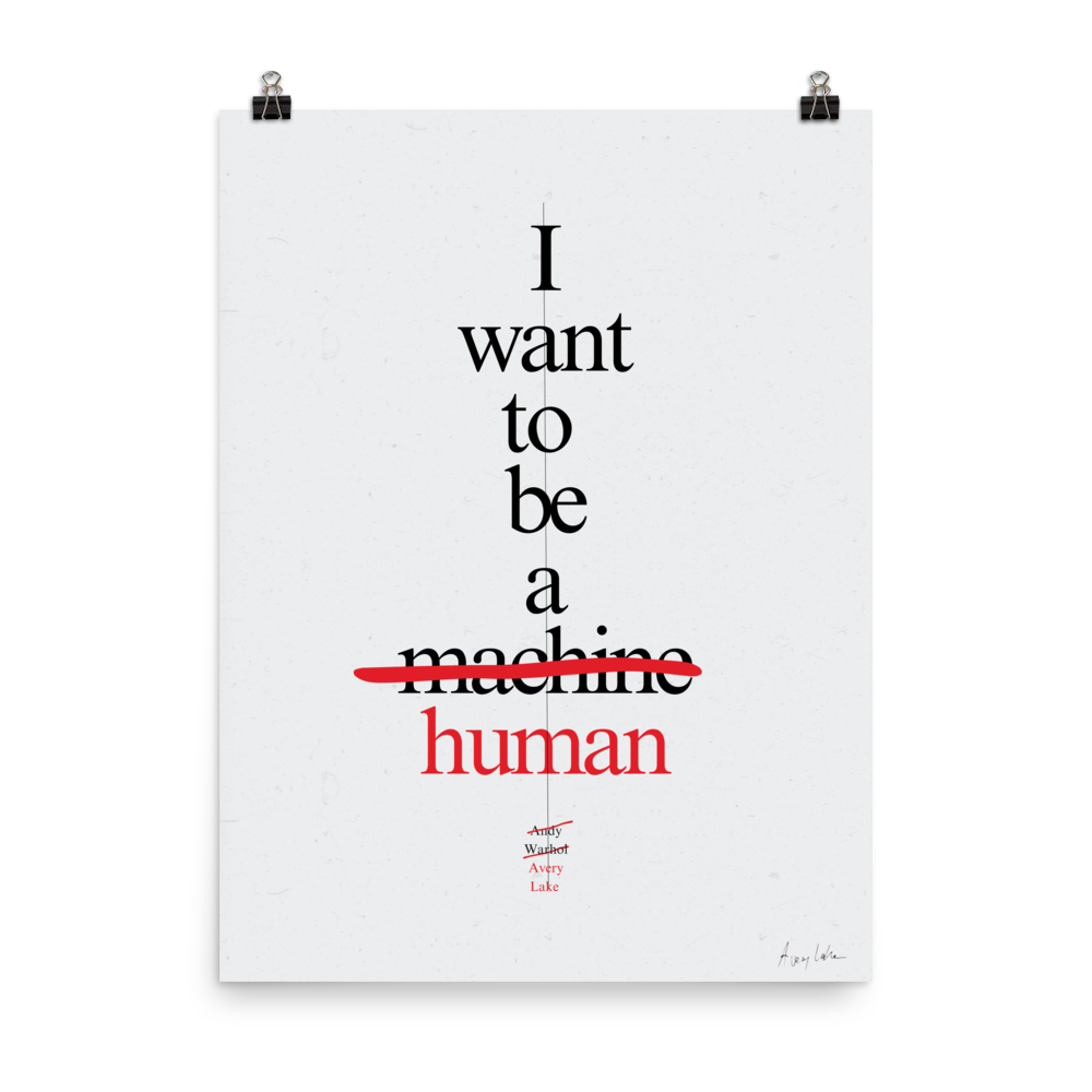 This piece reinterprets Errata through the work I’ve done on Andy Warhol. Where Warhol (allegedly) famously said I want to be a machine, I’ve replaced it with something more adapted for today's age.